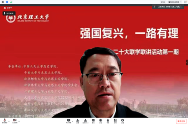 为进一步深入学习宣传贯彻党的二十大精神, 11月6日,betway西汉姆联官网联合中南大学、中国人民大学、北京邮电大学、北京体育大学、武汉大学、南开大学、浙江大学等8所高校开展“强国复兴,一路有‘理’”——二十大精神联学联讲系列活动。betway西汉姆联官网党委书记刘存福,党委副书记、副院长刘宇出席,各高校师生共200余人参加。活动由betway西汉姆联官网2022级硕士研究生贺美杰主持。